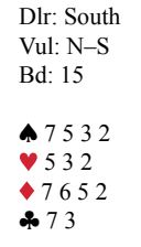 Her var normalkontrakt 4 spar. Så også på min hånd i vest. Ut kom en single hjerter til A og K i tur og orden fra syd. Ser mørkt ut, eller. Tredje hjerter til stjeling i nord med spar J, og tilbake kommer etter grukk.....en kløver. Jule(bord)kvelden tenkte jeg og snellet raskt sammen 10 deilige stikk for utgang. Men hva spilte syd tilbake i stikk 3 ettersom surrekoppen i nord spilte kløver og ikke 2 beiter med ruter Q tilbake? Jo, hjerter 2. Spiller det noen rolle da, makker må jo skjønne at det skal ruter tilbake. Men slik er dette spillet, gi makker signal om tilbakespill, og lavt kort et laveste farge.