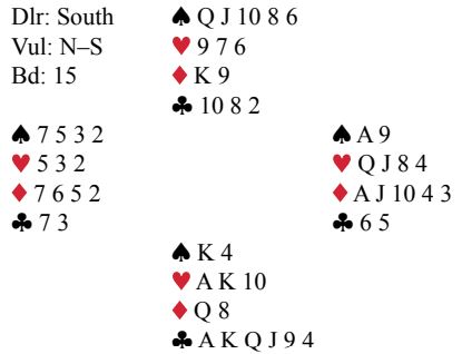 Syd åpnet med en sterk kunstig 1 kløver. En intelligent pass kom fra Engle (vest), og nord svarte 1 ruter som viste 0-7 poeng. Nå kom øst innpå med 2 ruter, og syd doblet som ble forklart som sterk og semibalansert. Da tenkte Engle det kunne være kult å delta i dette meldingsforløpet og hoppet like godt til 4 ruter! Nord doblet, og det gikk pass rundt. Slik så hele spillet ut: