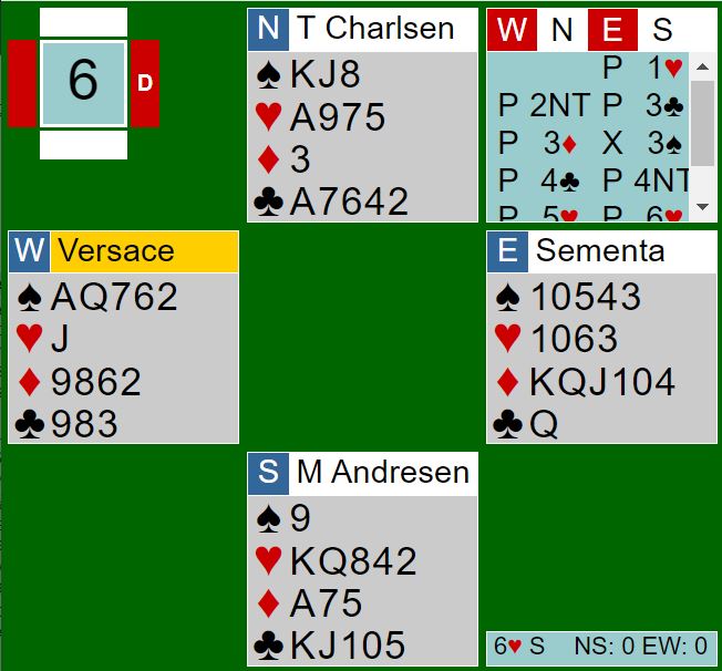 Det norske paret meldte altså slemmen. Vest spilte ut spar ess. Da Andresen fant ut at vest hadde singel trumf og øst tre vurderte han antagelig å spille på kløverfinesse gjennom vest og spilte etter uttrumfing kløver konge. Og det satt 3-1 i kløver med trekorts hos vest. men da damen satt singel var det ingen problemer uansett, +980 og vunnet spill. Merk at Versace tok for spar ess i utspillet og kunne dermed vunnet spillet om N/S var i 6 hjerter ved det andre bordet med tretten stikk. Men det gode utspillet var til ingen nytte her. Spillet viser hvor små marginer det kan være i BAM.