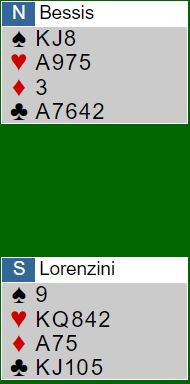 Lorenzini fikk ruter ut. Siden kløveren ordnet seg fikk han tretten stikk da spar 9 kunne kastes på den femte kløveren. I BAM kan det ekstra overstikket være gullkantet hvis N/S er kun i utgang ved det andre bordet og sparutspill blir funnet.