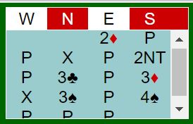 Som du ser kan N/S vinne utgang, for eksempel 3NT. Det finnes ikke inntak til østs ruterfarge. Ved det andre bordet åpnet også øst, der med svake 2 ruter. Derfra gikk meldingene slik: