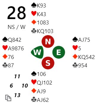 Jeg vet ikke om N/S hadde helt kontroll på dette, men syds 2NT-melding gjorde at grandkontrakt ikke var så fristende. Grandkontrakten ville blitt på feil side, for de visste jo ikke at ruter ess satt foran. Så det ser litt ut som de snublet seg ut i 4 spar, en sårbar kontrakt med kun 4-3 i trumf. Det måtte sitte litt snilt.