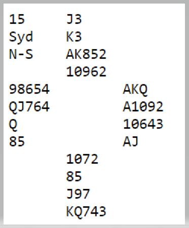 Her var nok tranflasken ganske tom etter dette meldingsforløpet. Men lilleslemmen var faktisk nedlegg etter ruter ut som selvsagt alle spiller med nords kort. Det var bare å stjele seg over til vest og ta finessen i trumf, så ut med trumfen etterfulgt av sparhonnørene. Deretter over til vest igjen med ruter til stjeling for å innkassere sparstikk med kløveravkast – easy game, vunnet slem.