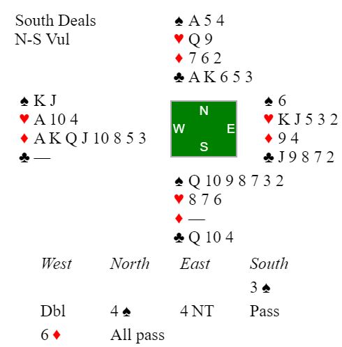 Ware doblet opplysende. Nord meldte 4 spar, og øst Matt Mc Manus sa 4NT - to steder å spille, normalt på femtrinnet. Ware valgte imidlertid et tredje sted og goppet til 6 ruter som ikke akkurat var hva Mc Manus hadde håpet på!