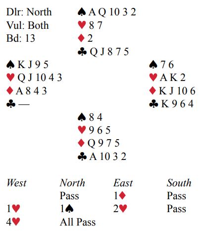 Mot 4 hjerter spilte Rigals makker ut sin single ruter. Spillefører la knekten, og syd lot være å dekke. Så kom spar 7 til åtteren, nieren og nords tier. Nord skiftet til trumf som ble vunnet hos blindemann fulgt av mer spar til nords dame og enda en trumf kom derfra. Nå vant vest stikket, så spar konge for å presse ut esset. Men nord lot korrekt være å dekke. Hvis det kastes et kort fra øst trumfer syd, men i så fall er han innspilt. Spillefører visste dog ikke sikkert at syd satt med kløver ess, og heller ikke med 100% sikkerhet hvordan ruteren satt fordelt. Så spillefører valgte å trumfe høyt med østs siste trumf. Så ble en kløver trumfet på hånden og syds tredje trumf tatt ut. Dette var blitt posisjonen: