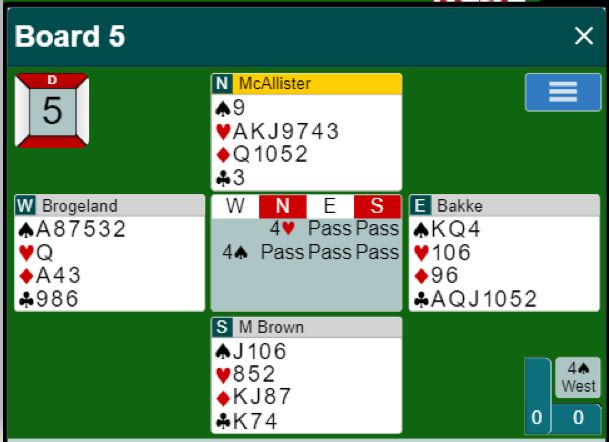 Brogeland-Bakke sine lagkamerater som satt N/S ved det andre bordet trodde nok de hadde et stort tapsspill på listen sin da Ø/V vant 2 spar doblet, Ø/V +670. Men Mc Allister-Brown var ikke heldige med sine avgjørelser i dette meldingsforløpet og ble ubønnhørlig straffet da Brogeland doblet den grusomme kontrakten 5 ruter. Der ble det tre doblede, +800 til Ø/V og 4 IMP. Det var nok en veldig positiv overraskelse for Rosenthals N/S-par.