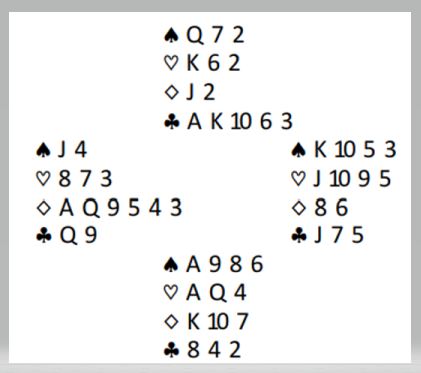 Problemet i dette spillet er å identifisere hvem som er den "farlige motspilleren". Da dette spillet forekom i en treningskamp og jeg spurte det spørsmålet sa de ferske spilleren ganske kjapt "vest er den farlige". Ja, det er vest som kan ta mange stikk, fem ruterstikk faktisk om ruteren blir gjennomspilt. Men det er øst som er den "farlige motspilleren", den motspilleren du ikke kan slippe inn. Kan det unngås og likevel få godspilt kløveren som du må leve av?