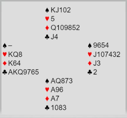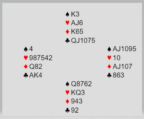 Kaja Brekke (vest) sin dobling av 1 spar var støttedobling som viste eksakt trekorts hjerter. Idet N/S var i 4 spar fikk Kaja vist sine kort godt med meldingen 5 kløver. Vegard korrigerte til 5 hjerter. Syd som satt med tre ess og en makker som hadde vært med i meldingene syntes at nå fikk det være nok: dobler.