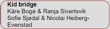 Men det var altså Kid bridge som triumferte til slutt, og Kåre Bogø, Ranja Sivertsvik, Nicolai Heiberg-Evenstad og Sofie Sjødal blir de norske representatene i mix-klassen i Buenos Aires. Bogø og Sivertsvik er også med på laget som skal spille Mix EM for lag i Danmark i sommer.