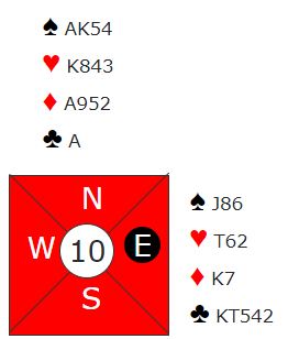 Med Syd (Roar Johansen) som giver ble det åpnet derfra med 1 hjerter.Øyvind Larsen i Vest hoppet innpå med 4 ruter og Ove Gundersen i Nord så ned på jevn hånd med 19 hp. Her måtte noe kraftig gjøres, men hva ville du meldt? Innhoppet varslet jo veldig skjev fordeling imot og går spilltet i hjerter kan det jo godt komme den fargen ut til stjeling i Øst der Arild Pettersen satt. Derfor ville spill i grand passe bedre enn i hjerter, og dermed smelte Gundersn til med hopp direkte til,6 NT!