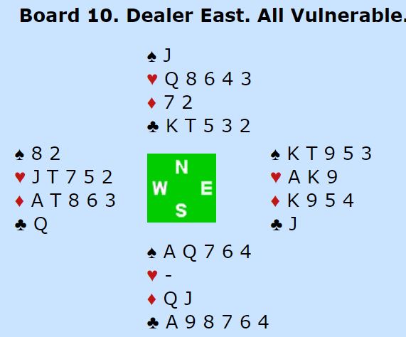 Vest spilte ut hjerter knekt. Da var det bare å trumfe, spille seg over til nord på trumfkongen og ta sparfinessen. En ruter forsvinner fra nord i andre runde spar og det er igjen fire trumf hos nord til å trumfe en ruter og tre spar (om nødvendig kan hjerter dame godspilles også) - tolv stikk. Det ga en massiv +1370 til notering.
