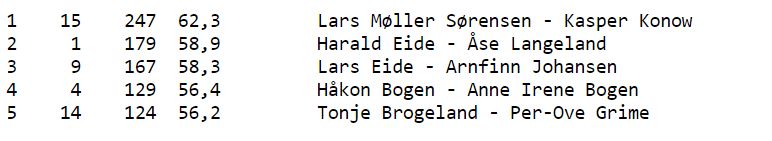 Etter to spennende kvalifiseringsrunder ble det følgende tre par som skal representere klubben i finalen: Tor Ivar Bang og André Hagen, Olav Lomsdalen og Sigurd Frydenlund samt Lars Eide og Tormod Røren. Vi er sikre på at disse seks vil være gode representanter for klubben ved en slik anledning, og vi har også et berettiget håp om at de kan hevde seg bra i finalen og kanskje - med litt "stang inn" - kan de bringe med seg medaljer hjem fra Storefjell.