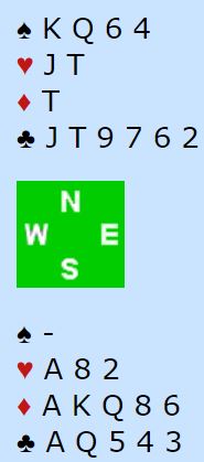 Det er en ganske hardmeldt men sjanserik slem. Det er bare ti toppstikk (2+2+1+5=10), men muligheter i begge de røde fargene. Sånn som det sitter ordner det seg på flere måter, og da hjerteren etter hvert kommer i spill blir det greit å vinne slemmen siden hjerteren sitter veldig snilt med damen i saks og 3-3 fordeling i mot.