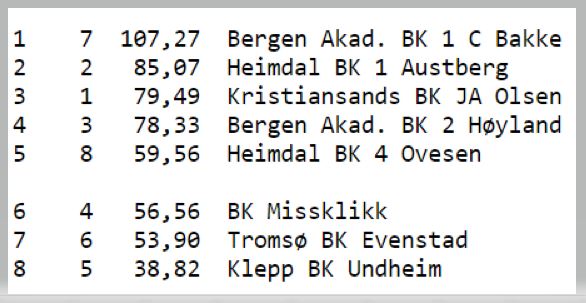 Dermed blir den største spenningen kampen om sølv og bronse. Bergen AK 2 har over 8 VP margin ned til Heimdal BK 1 - Austberg på tredjeplass. Så gull og sølv vil mest sannsynlig gå til Bergen, men en vet aldri. Bak Heimdal er det Kristiansand BK - Olsen som er nærmest, og de må hente inn 6,3 VP på trønderne om det skal blir sørlandsk medalje.