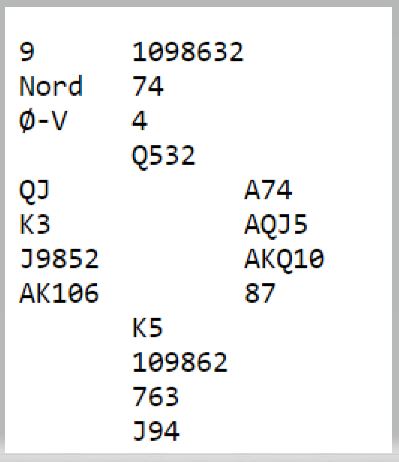 Av de 6 bordene som spilte var bare ett i 6 hjerter. Ikke overraskende var det Jan P. Johannesen (V) som ble spillefører i 6 hjerter med Morten Andresen som makker i Øst. Over 5 spar ble det fightesp A kommut til røff og da Nord hadde vist gode kort var det nok rimelig å satse på Hj K der, altså røff og hjn A ble lagt ned i håp og singel konge bak, men da var det -1, 50 ut og bunn.