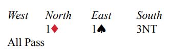 Du sitter øst (bak blindemann) og har meldt inn 1 spar over nords åpning med 1 ruter. Hele meldingsforløpet blir kort: