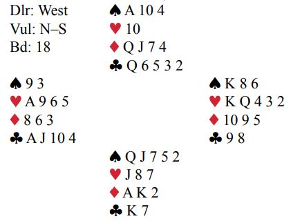 Jeg spilte ut ruter ess, og ser at jeg nå antagelig gjør lurt i å skifte til hjerter for å eventuelt etablere stikk der. I stikk to vrir jeg dermed til hjerter. Kristinn antar helt rett, at Frank har kongen, og stikker derfor opp med esset. Så tar han ut trumfen, og deretter kløver konge, kløver ess og kløver til stjeling. Da faller dama, og Kristinn er tilbake til 11 stikk igjen.
