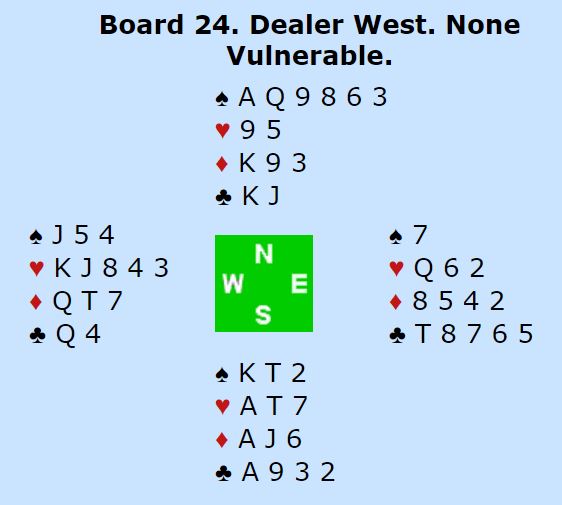 Whibley spilte kløver til damen som vant stikket. Så tok han for hjerter ess-konge før kløver ess ble spilt. Kongen falt ikke, og vest fikk for den i neste stikk. Derfra kom en lumsk liten ruter. Igjen, så såre enkelt for oss som ser hvordan det sitter, men å legge knekten nå blir fælt om øst har damen. Så esset tok det stikket. Spillefører hadde nå 0+2+2+4 = 8 stikk, og flere muligheter for det niende.