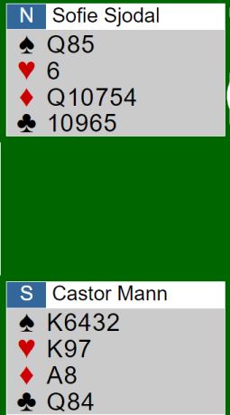 Sofie og Castor hadde disse kortene. Og det gjelder å spille mot rett par til rett tid, spesielt i parturnering hvor man møter de andre parene i noen få spill. Med med kun et par spill mot et enkelt par kan man godt få juling selv mot ganske svake motstandere. I tillegg til å spille godt selv gjelder det å møte dem som melder for mye når det blir bet, og dem som ikke melder når de burde meldt. Slikt jevner seg ut over mange turneringer, men i en sesjon kan den type gli, eller ugli avgjøre mange plasser på resultatlisten uansett hvor godt man selv spiller.