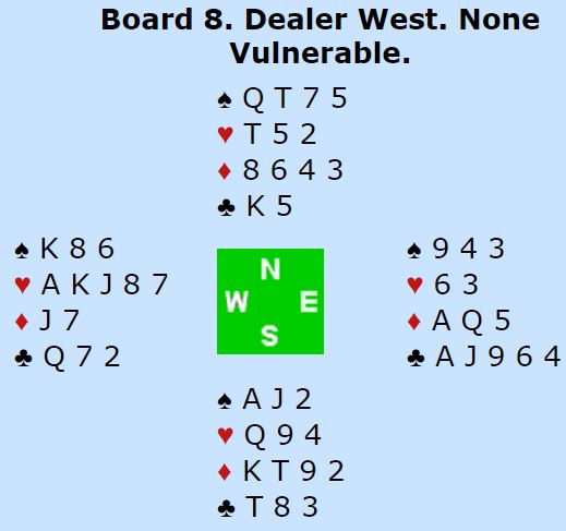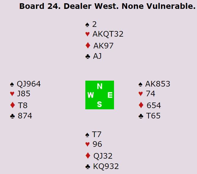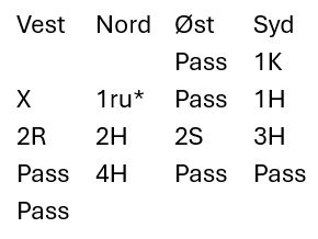 Ganske uvanlig, N/S har slem i begge rødfargene, men de lar Ø/V få spille doblet delkontrakt med en trumffarge hvor de har ti kort til sammen!