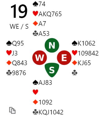 En er å vinne utspillet med kløver ess og stjele en hjerter. Så ut med trumfen. Hvis trumfen sitter 2-2 er det helenkelt. Da kan nords tredje kløver brukes som inntak til å stjele en hjerter til i tilfelle den fargen sitter 5-2, og eventuelt ta tretten stikk om hjerteren sitter 4-3. Eller en kan legge seg på tolv stikk ved gi bort ett sparstikk og stjele en spar, altså om trumfen sitter 2-2.