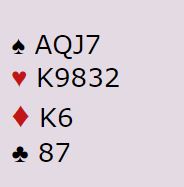 Nå kunne ikke kontrakten betes, Vest tok sine 3 sparstikk og prøvde en desperat liten hjerter, men nå tok Syd resten. -430 og 7 IMP til England, da N/S stoppet i 3♦ ved det andre bordet og fikk 11 stikk. Men hvis du fant hjerterskiften, tar dere de første 8 stikkene og vinner 8 IMP isteden.