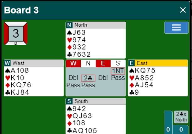 I 3 kløver doblet spilt av nord ble det tre stikk, seks bet utenfor sonen og -1400 som i praksis ikke føles særlig bra. Men i teorien er det resultatet ikke så galt om en tar med i betraktningen at Ø/V kan vinne +1370 i 6 ruter. Og med 1100 inn til Norge ved det andre bordet kostet spillet «bare» 7 IMP.