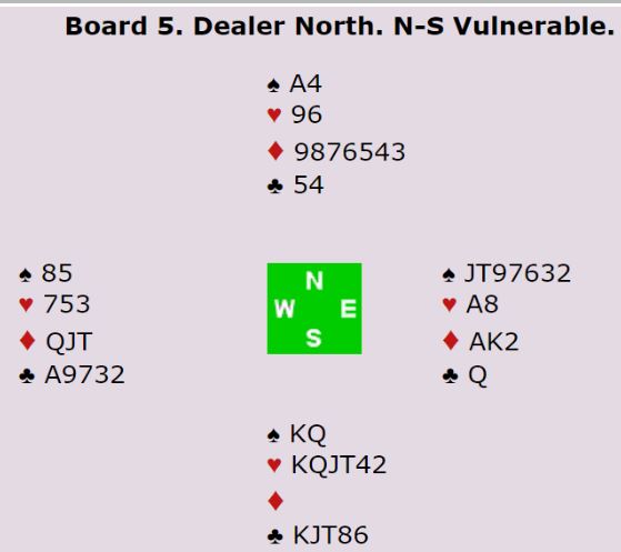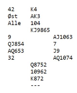 En ser jo i ettertid at Ø/V vinner 6 ruter, ja faktisk kan de vinne en usannsynlig 6 spar også siden spar sitter 3-3. Men det er nok ikke en opplagt slem med 30 HP til sammen, og det er omtrent umulig å melde slem etter syds åpningsmelding.
