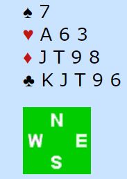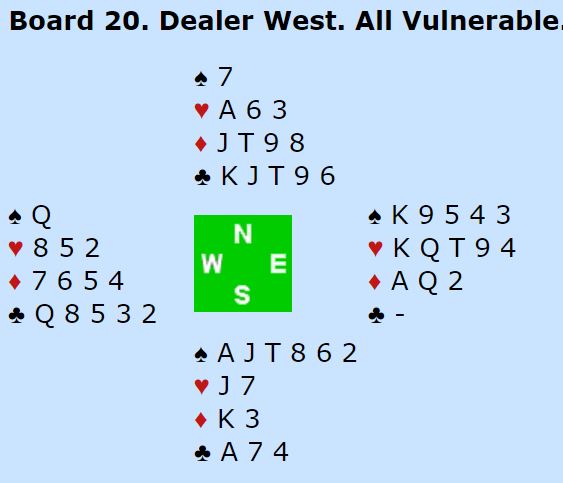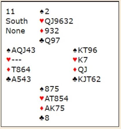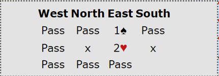 Der vest doblet og dermed viste minst trekorts hjerter, og som regel firekorts i den umeldte majorfargen ble ikke øst til å stoppe. Men nord har super hånd for sparkontrakt også. Idet Ø/V er i 4 hjerter blir det et valg for nord, melde 4 spar eller håpe det blir bet i 4 hjerter. Syd har nok håp om bet i 4 hjerter med ett ess og A-K i en annen farge. Men 4 hjerter står enkelt siden kløver konge sitter i saks. Hvordan er det med 4 spar?