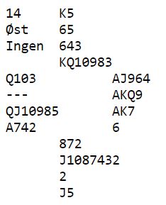 Hele resultatlisten, kampresultater og butler finner du her. På butleren var det Berg-Ovesen som tronet øverst med kruttsterke +1,86 IMP per spill. Og det paret var også det eneste som meldte seg frem til toppkontrakten og vant den i dette spillet: