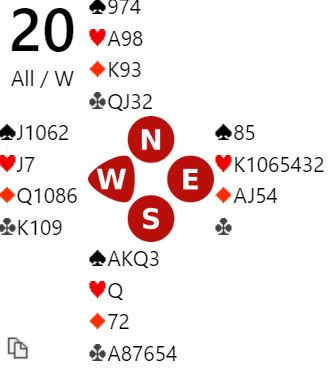 Jeg synes 2 hjerter blir for dumt, for spillesterke kort. Det er sjelden bra å ha det syvende kortet når det åpnes med svake 2, for makker tror du har bare sekskorts farge og vil ikke være med de gangene det er rett å melde. Å si 3 hjerter er kanskje greit, men Whibley slo til med 4 hjerter! Syd kan godt være sterk, og N/S kan fortsatt ha et stort spill. Å sperre høyt og luftig kan bli feil men det setter i all fall press på motparten!