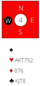 Så meldingene starter nok med 1 kløver og 1 spar innpå fra øst. Da sier syd 2 hjerter, naturlig rundekrav. Nord støtter hjerteren. Nå vet ikke N/S hvor gunstig det står til i ruter. De vil normalt stoppe i utgang selv om det gjøres et optimistisk slemforsøk, for da finner de ut at de manger både ett nøkkelkort og trumdamen. Det er dessuten mulig at vest med bra spartilpasning vil være med i meldingene også.