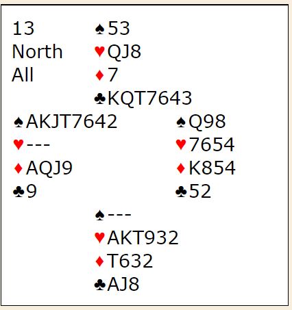 Fordelingskort så det holder, og da blir det ofte sving. N/S har kun en taper i kløverkontrakt, men Ø/V kan få to motspillstikk hvis N/S får spille med kløver som trumf. Da må de få med seg ruterstikket og ett trumfstikk (!) med hjerterspill fra øst som vest kan trumfe med sin single trumfnier. Det motspillet finnes neppe i praksis, så N/S vinner normalt tolv, eller tretten stikk (hvis de ikke får med seg ruterstiket sitt) i kløverkontrakt. Om de får spille det da...for hva med Ø/V i sparkontrakt?