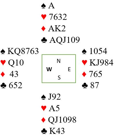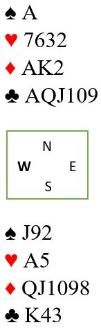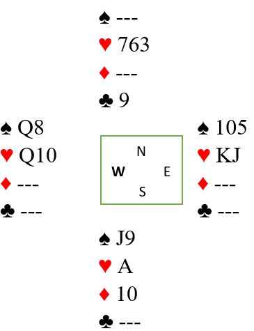 På ruter 10 fra syd må vest kaste først, og han må holde to spar. Hvis han kaster spar 8 kan simpelthen spar 9 trumfes hos nord, spar dame kommer på, og syds kort står. Så vest holder to spar, og det betyr at han har igjen kun en hjerter idet det er tre kort igjen.