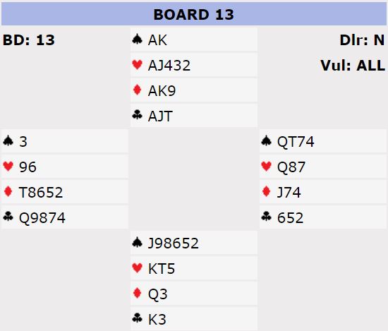 I 6S har man den fordelen at en hjerter kan kastes fra syd på ruter, så et eventuelt hjertervalg behøves ikke. På den annen side er 6S sårbart og går ofte bet om en motstander har fire spar da det som regel gir to spartapere. Kontrakten 6H er veldig bra, den kan godt stå selv om det blir en hjertertaper. Også i 6NT er det svært gode muligheter. Først kan hjerteren løse seg, og i så fall blir det tolv eller tretten stikk i NT. Om det bommes i hjerter er det to andre sjanser, spar dame kan sitte singel eller dobbel, eller en kan til slutt prøve kløverfinessen. Det er også skvismuligheteri NT kontrakt om det blir en hjertertaper, men da må det gjettes på sitsen.