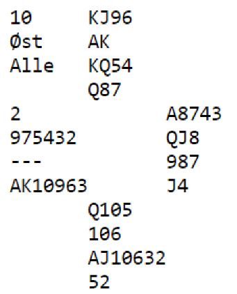 Andre steder ble det mye større scorer, og i begge retninger, Det står i 3NT N/S pga. heldig kløversits. Delt topp N/S gikk til to par som fikk +660 for 3NT med elleve stikk.