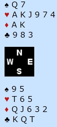 Det er to spartapere. Ø/V tar de t stikkene med esset fra øst og spar til vests konge i andre stikk. De må få for kløver ess også. Så kontrakten avhenger av trumfbehandlingen. Bør det spilles to store trumf og håpe på 2-2, eller ta en honnør, og prøve finessen andre gangen? Det er valget, ikke enkelt og ikke særlig stor forskjell i prosentsjanser.
