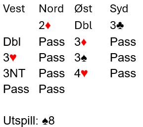 Nord får altså tre trumfstikk, syd får ett, dvs. fire motspillstikk i trumf. Men vi fikk ingen av dem....