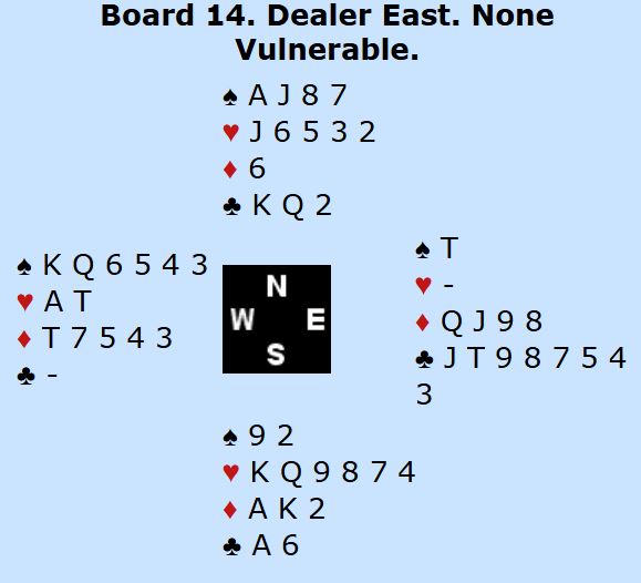 Noen av de som fikk spar konge ut mot 6 hjerter gikk to bet, for naturlig nok prøvde de kløveren med det samme. Da fikk vest stjålet, og forsvaret fikk to trumfstikk og ett sparstikk.