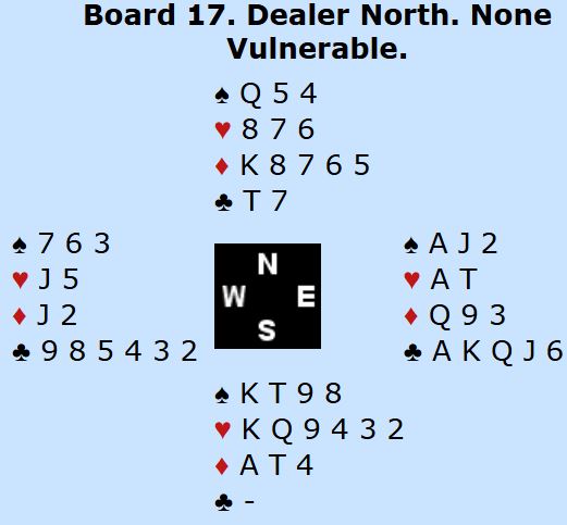 De er N/S som har høyeste kontrakt, 4 hjerter. Endel par kom seg faktisk dit. Min 2 kløveråpning slapp syd lettere innpå enn om åpningen hadde vært 2NT. Og han sa 2 hjerter, men nord var ikke med. Makker (vest) doblet som for oss viser 0-5 poeng. Da kunne nord ha sagt 3 hjerter og vi ville vært i fare for å spille mot 4 hjerter, kanskje doblet (?). Men nord passet, og 2NT fra øst ble løftet til 3NT av vest.