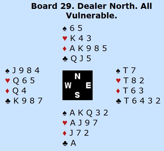 Det er jo ingen god storeslem, men en fin lilleslem. Det var noen som var i 7 ruter, og noen få vant den etter uheldig hjerterutspill. Resten spilet 6NT eller 6 ruter, bortsett fra ved ett bord...