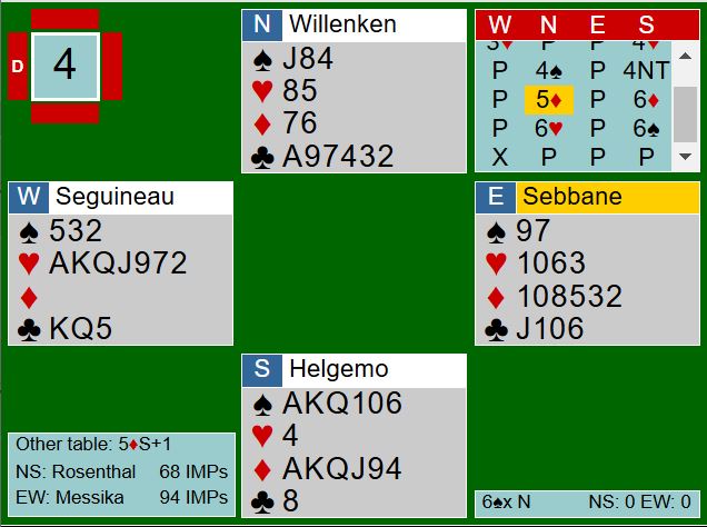 Willenken gikk også bet i en 6 kløver som kunne vært vunnet. Spilleføringen der kan sikkert diskuteres, men det er kanskje en del å si i favør den aktuelle vinnervarianten. Det ble imidlertid uavgjort spill, og vi lar det ligge. Men se her: