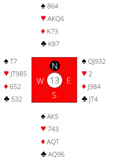 Det står i tolv stikk i NT. Storeslem er avhengig av full uttelling både hjerter og kløver. Ikke uventet var en del N/S-par optimistiske og meldte 7NT som gikk en bet. Faktisk fikk ca. 40% av Ø/V-parene +100 for hente en bet i 7NT, og det ga +45 av +68 oppnåelige poeng til Ø/V. De aller fleste spilte 6NT og noterte +1440 som ga +29 til N/S. Det var noen få utganger også samt to par som må ha hatt misforståelser da de spilte delkontrakter.