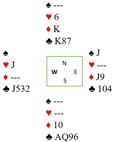 Spilles rett etter nesen og det sitter slik blir det bet. For å legge opp til en skvis må det altså gis bort stikk til spar dame i første stikk (eller vinne første stikk og gi bort ett sparstikk i andre stikk). La oss si det skjer at øst får for spardamen. Så kommer spillefører inn og tester hjerteren. Ingen suksess der, men spillefører har fortsatt to sjanser; kløveren kan ordne seg med fire stikk, og det kan være en skvis om vest også har kløverstopperen. Nå tas det andre sparstikket og de tre ruterstikkene. Før det siste ruterstikket ser det slik ut: