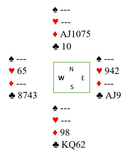 Etter å ha tatt ut trumfen spilles altså sparen for å eliminere fargen og få til et innspill om nord har kløver 10 og syd begge kløverhonnørene. Siden sparen satt 3-3 forsvinner en kløver på vest fjerde spar, men med gjenværende A-J-9 er det fortsatt fare for to kløvertapere sett fra spilleførers synspunkt. Etter ruter ut til stjeling, to runder trumf og fire runder spar ser det slik ut: