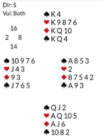 Det var en rekke ruterkontrakter på forskjellige trinn. Så kom det en rekke utganger i hjerter, og syv av dem fikk +650 for elleve stikk. Selv om det egentlig er ett stikk for lite ga det +18 (av +68 mulige). De som fikk tolv stikk i utgang (+680) noterte pene +40. Noen av dem fikk det veldig enkelt da syd spilte ut kløver konge som tok med seg tieren og esset - kun en kløvertaper.