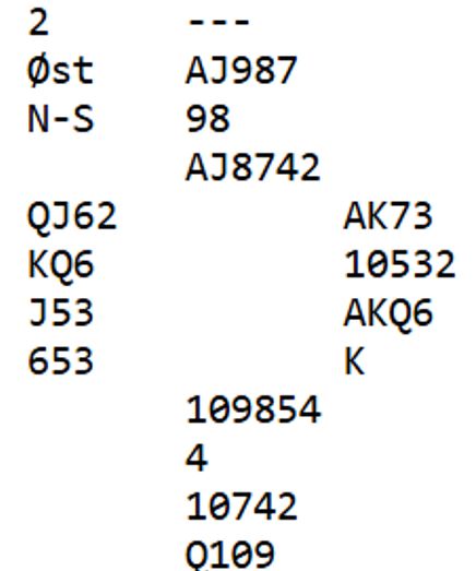 Å si 4 spar var nok i overkant hardt. Å løfte til 3 spar er nok. Men den håpløse utgangen ble ikke doblet, og syd skrapte sammen åtte stikk, -200. Lite visste N/S om at dette skulle bli et stort gevinstspill!