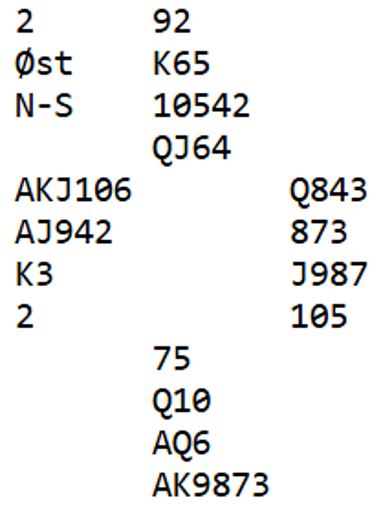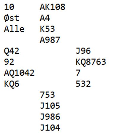 I runde 3 kom en spilleprøve en ville forventet at ikke var for vanskelig for lagfinalister. Du kan jo prøve deg selv som spillefører. Tips: feil i spilleføringer skjer ofte i første stikk, eller helt i starten av spillet.