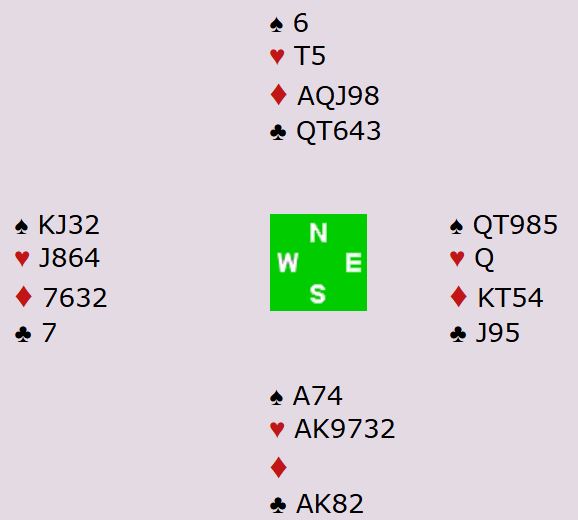 Du kan selv forsøke å finne ett vettugt meldinsforløp med det systemet du og din makker bruker. Det er klart at slike hender er lettere å melde med systemet 2-over-1 hvor svaret 2 kløver på syds åpning 1 ruter er definitivt utgangskrav.