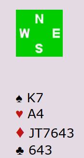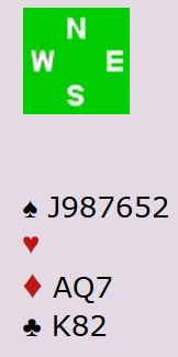 Vest åpnet med 1 kløver og fikk 1 hjerter til svar. Vest hoppet da til 2NT (18-19), og deretter presset øst på til lilleslemmen 6 hjerter.